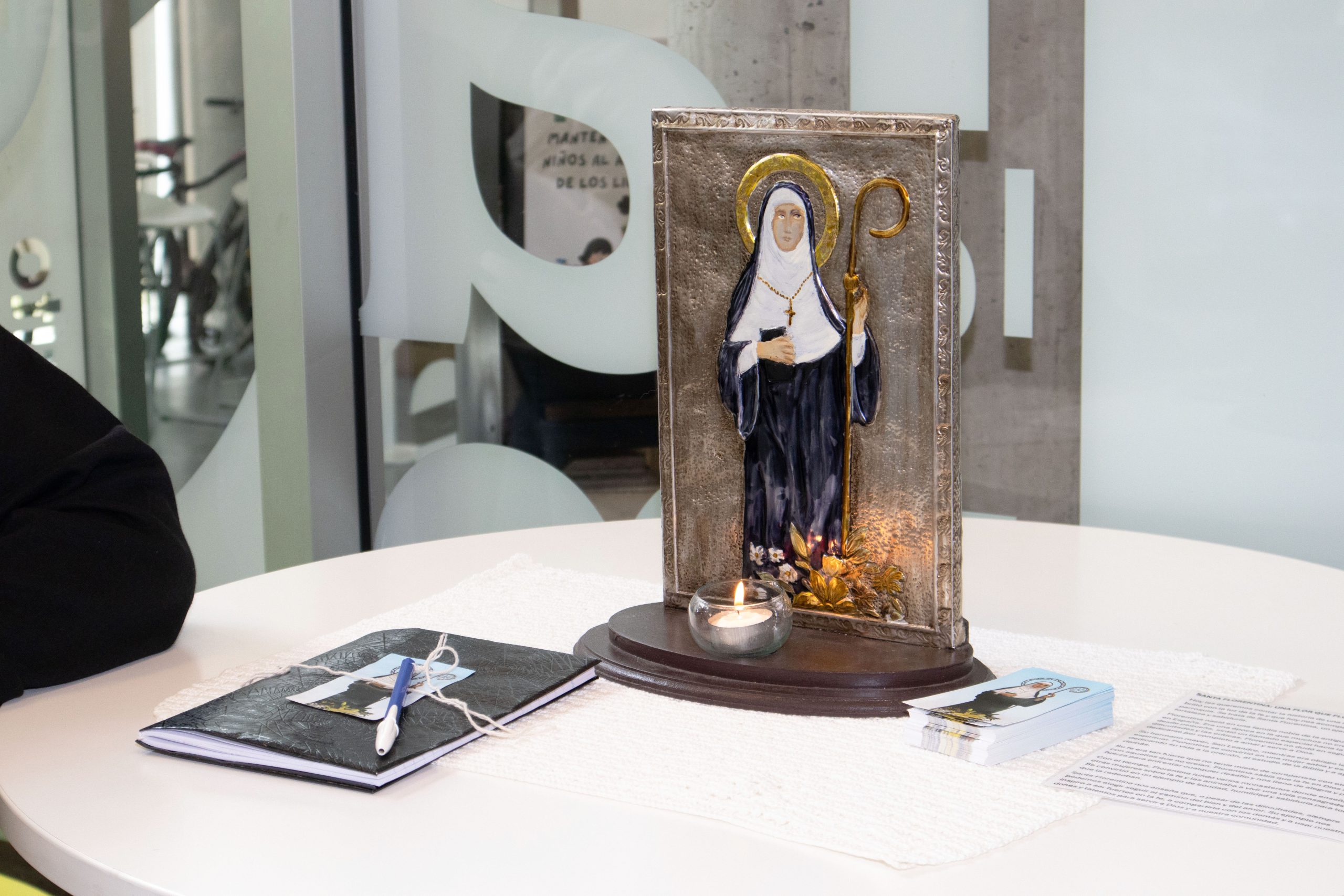 La imagen de la virgen Santa Florentina llegó a la Biblioteca Pública Municipal y fue recibida por la secretaria de Inclusión, Educación y Cultura, Elisa Abella.